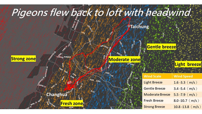 There are two different routes, which are divided into the orange zone and blue zone. Pigeons flew back to loft with headwind and the wind speed is very strong. The blue zone with a moderate breeze and the orange zone with fresh breeze.