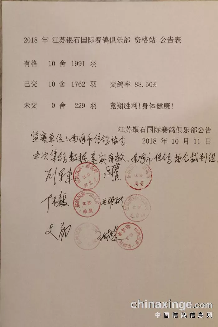 2018 Jiangsu Yinshih Internation Pigeon Club qualifying competition used Jixiangle GPS rings comprehensively