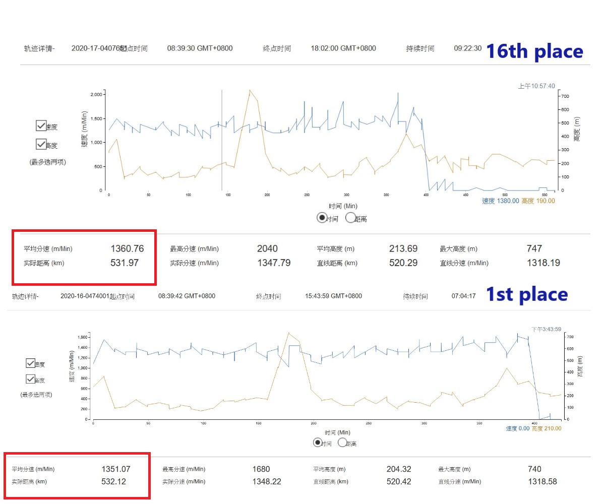 According to the GPS ring data, the 16th (A-Lee) arrived earlier 9 seconds than the champion(FuChi), but he didn’t go back the loft directly, so A-Lee couldn’t get the higher place. Besides, A-Lee’s averaged speed was 1360.76(m/Min), which faster than 1351.07(m/Min) of FuChi. The real distancing was 531.97Km of A-Lee which shorter than 532.12Km of FuChi. Therefore, we could speculate that A-Lee’s flying ability was better than Fu-Chi. If A-Lee had the other chance to compete again, he maybe can be the NO.1.