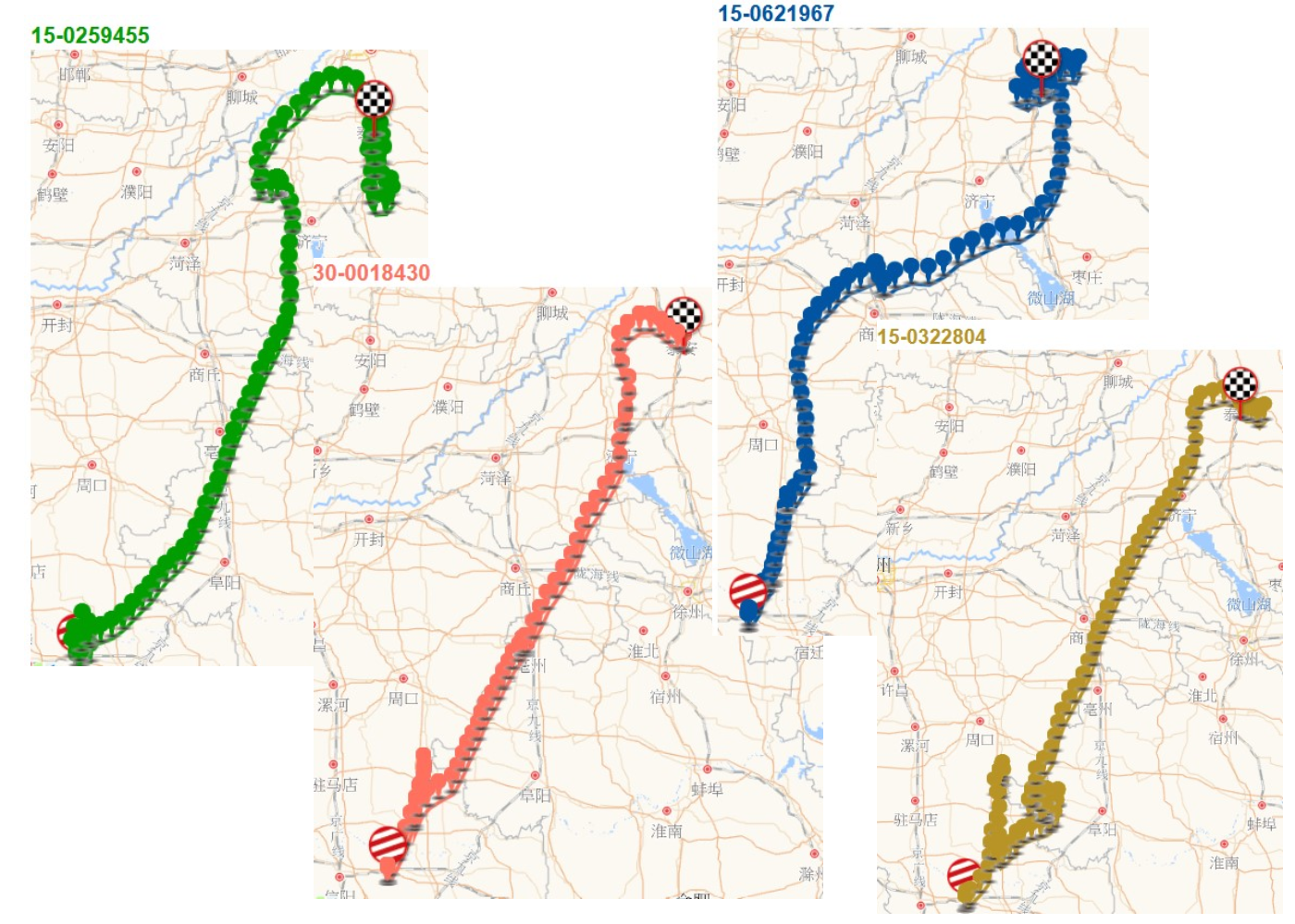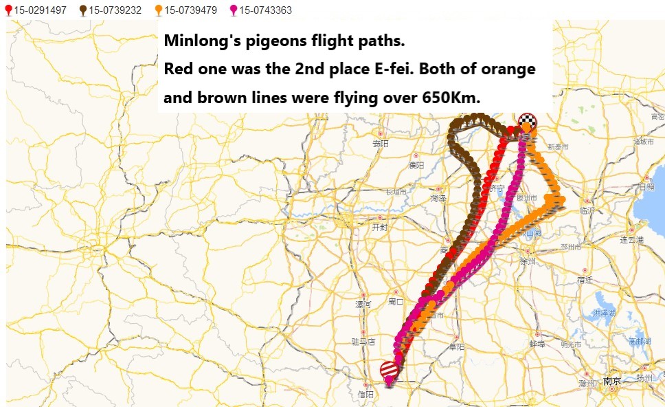 E-fei is coming form MinLong's loft, which still has other 3 pigeons in this race, As the screenshot of tracking paths, we know these 4 pigeons weren’t flying together, both of the orange path and the brown path were flying over 650Km to complete this race. MinLong said he is happy to know how was his boys flying even two of them didn't get the good score. but he is very happy to get the 2nd place this time.