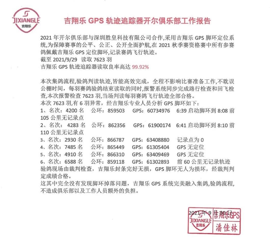 2021 Tangshan Kail Pigeon club cooperated with Shenzhen Shenghuang Technology Corp and used Jixiangle skyleader GPS rings in the 2021 Autumn Qualifying Competition in order to make the game fair and open. All participants wore the Jixiangle Skyleader GPS rings to record their flight tracks.