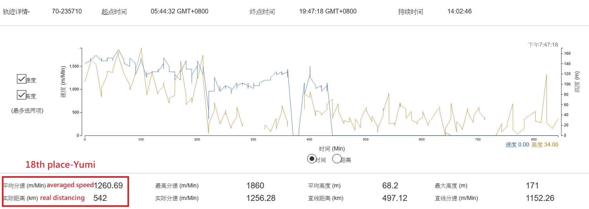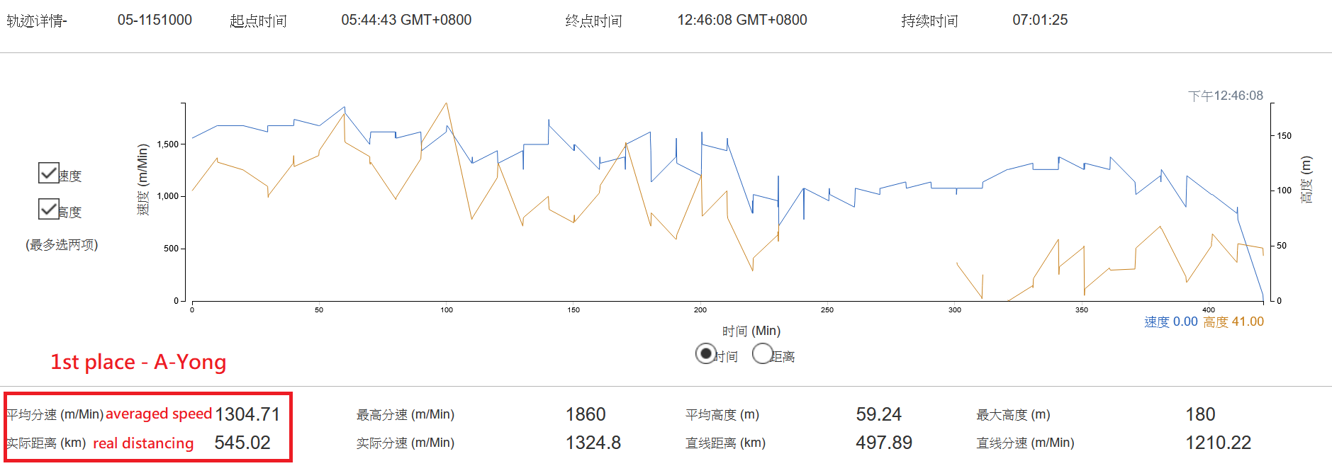 As you see in the photo. In the final game, the 1st place A-Yong, he was flying through 545.02km which was 7km longer than the 10th BaiBai. Due to the excellent flying ability of A-Yong, he could fly so outstanding under environmental conditions. Even all of the speed data are better than BaiBai. And the 18th place Yumi, although the flight ability is better than the 10th place BaiBai, the real distance is 4km more than the 10th place. So Yumi got 18th at the end of the game. In this kind of competition, the data shows us their ability is very close, but The ranking may be very different.