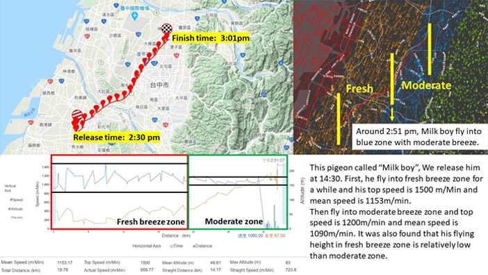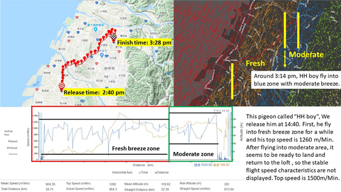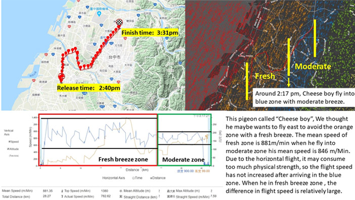There are two different routes, which are divided into the orange zone and blue zone. Pigeons flew back to loft with headwind and the wind speed is very strong. The blue zone with a moderate breeze and the orange zone with fresh breeze.